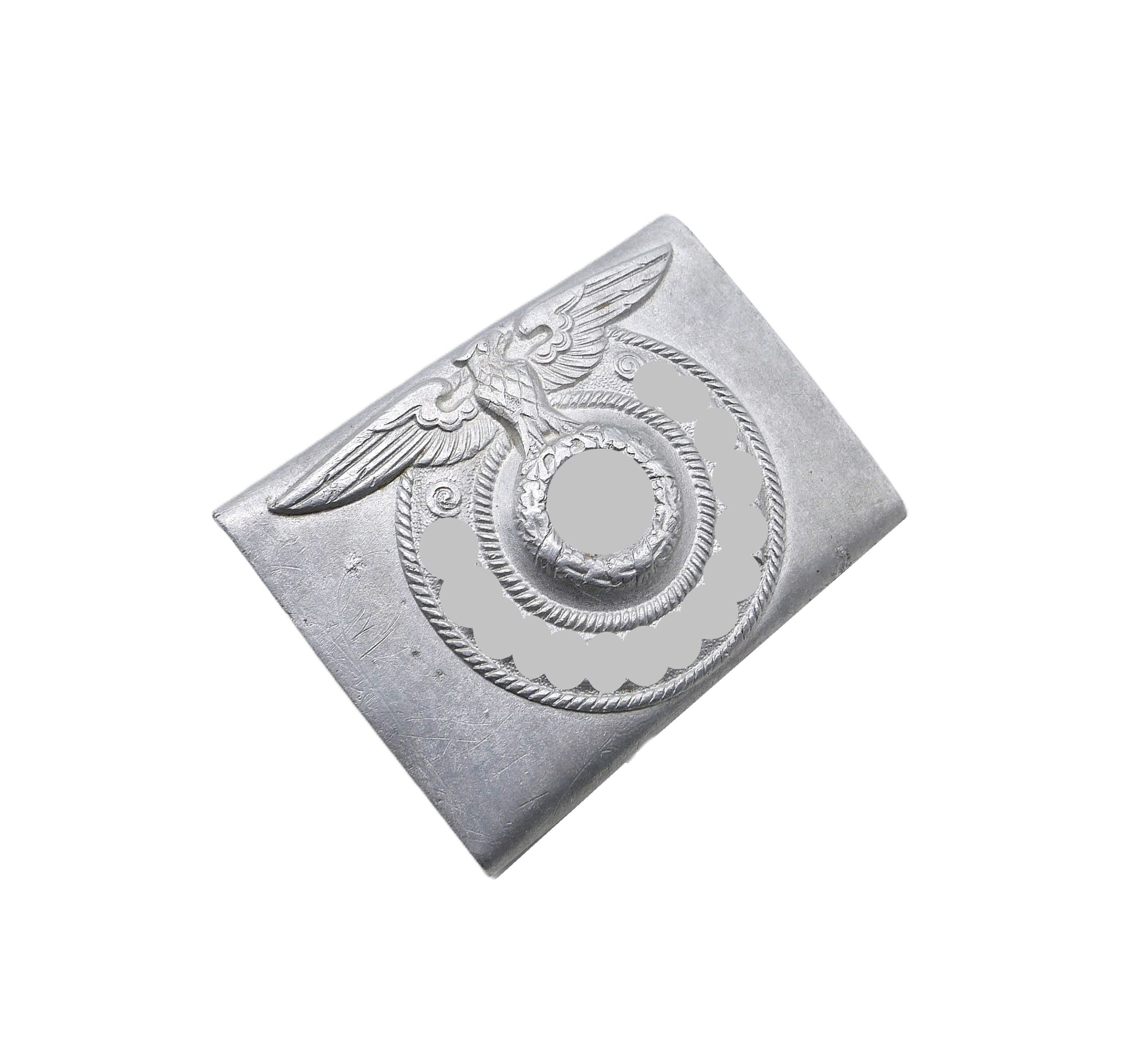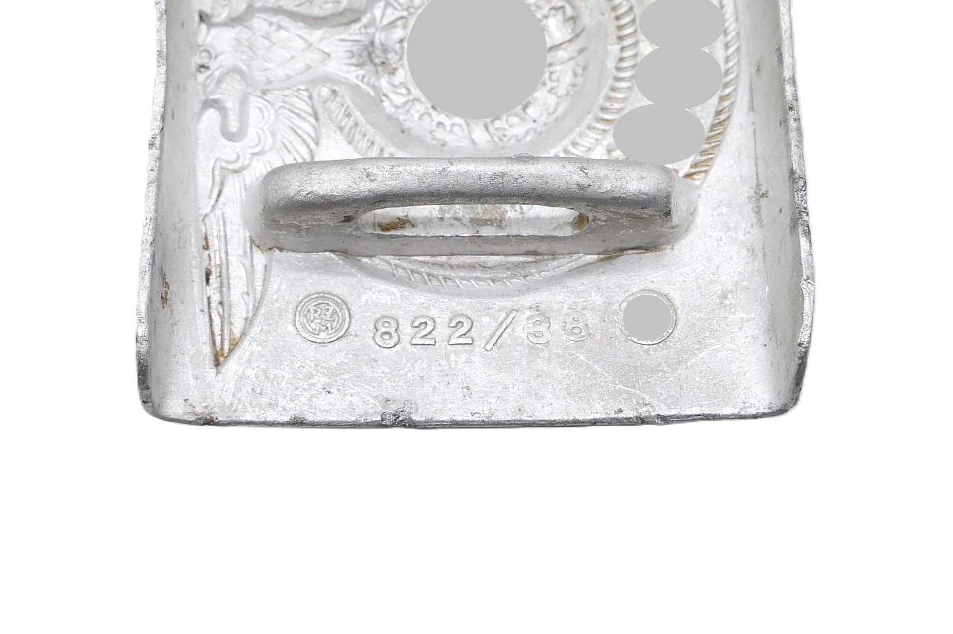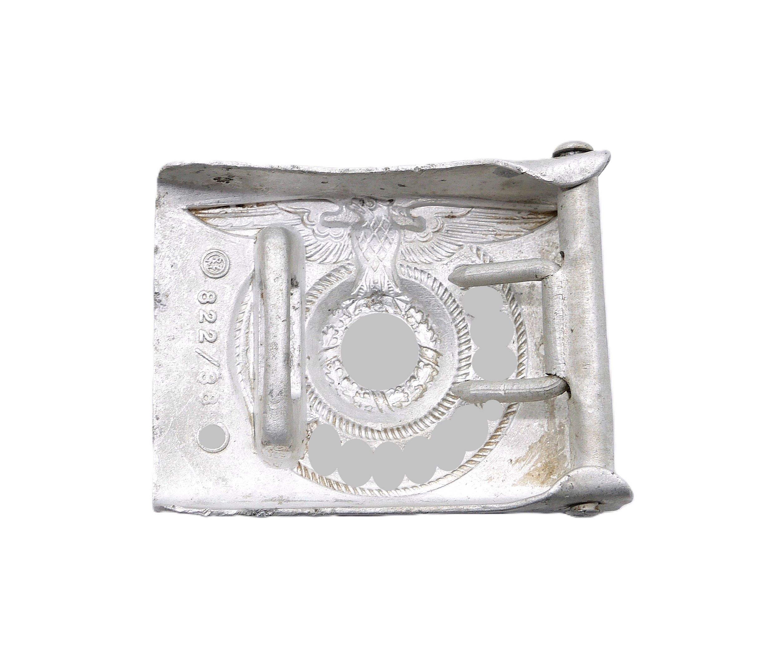 SS Koppelschloss für Mannschaften. Rückseitig RZM, SS und 822/38 für den Hersteller Richard Sieper & Söhne, Lüdenscheid. Aus Aluminium. Getragener Zustand.