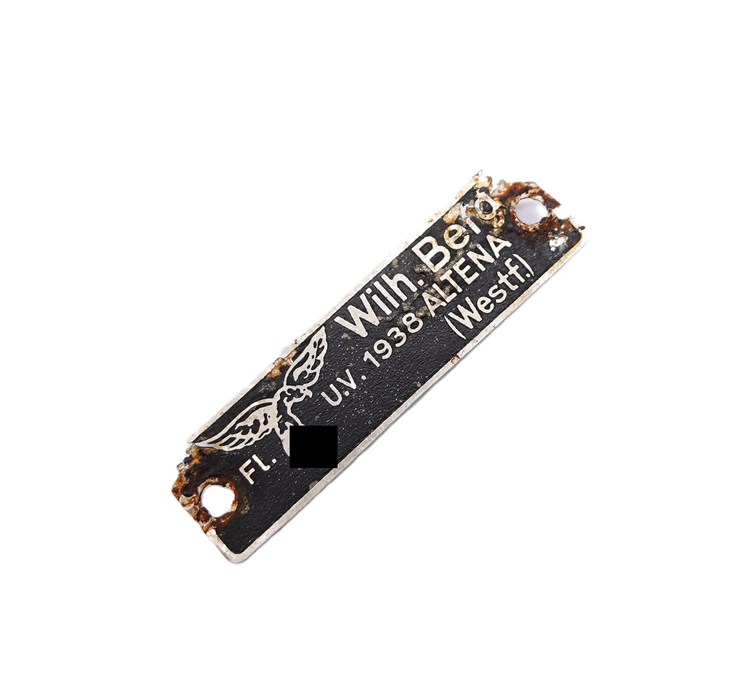 Typenschild – Plakette der Firma Wilhelm Berg – FL. U. V. 1938 Altena (Westfalen). Masse 6 cm x 1,6 cm. Bodenfund.