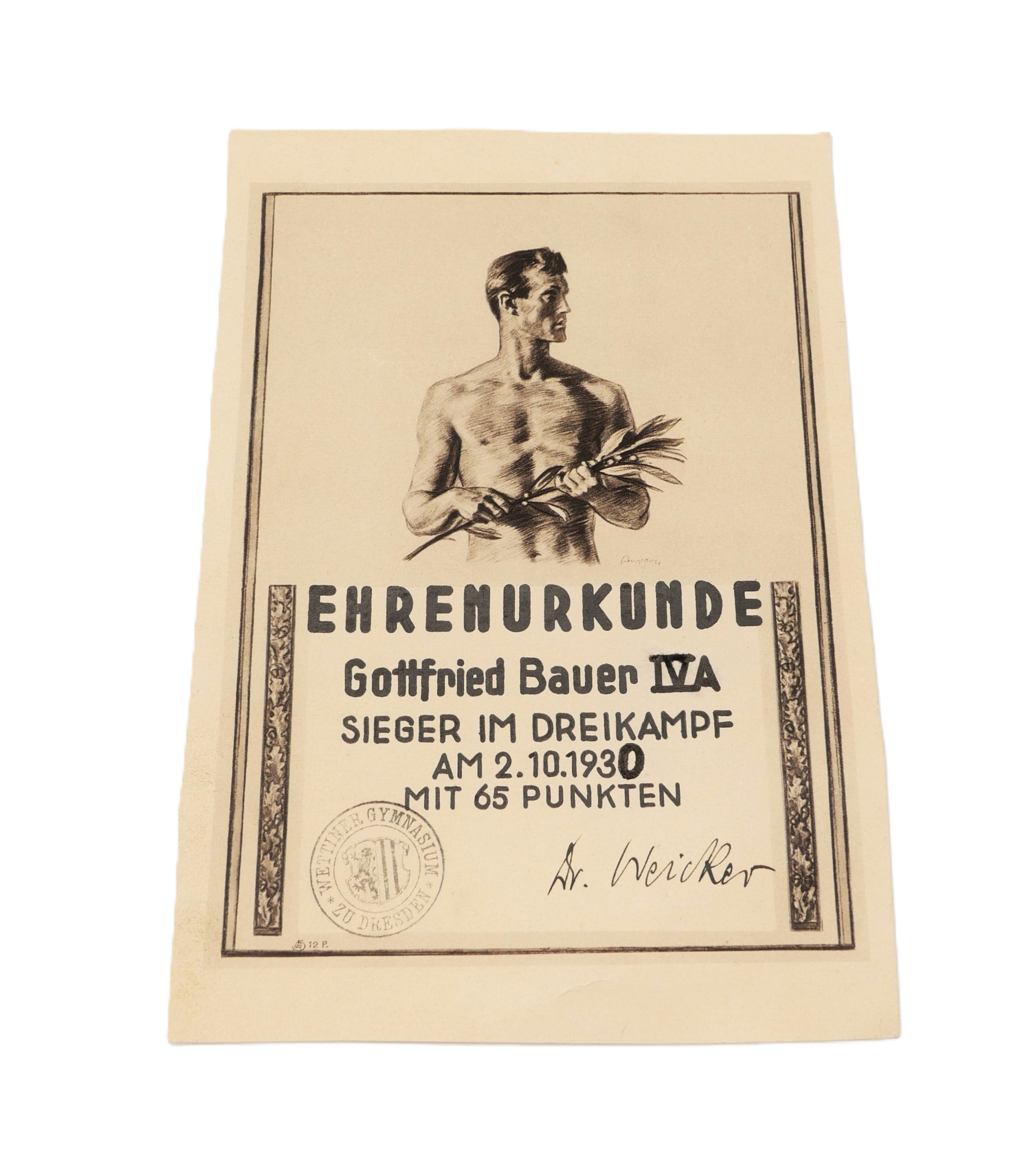 Urkunde/Ehrenurkunde – Sieger im Dreikampf 1930. Stempel vom Wettiner Gymnasium zu Dresden. Masse 22,1 cm x 15,4 cm.