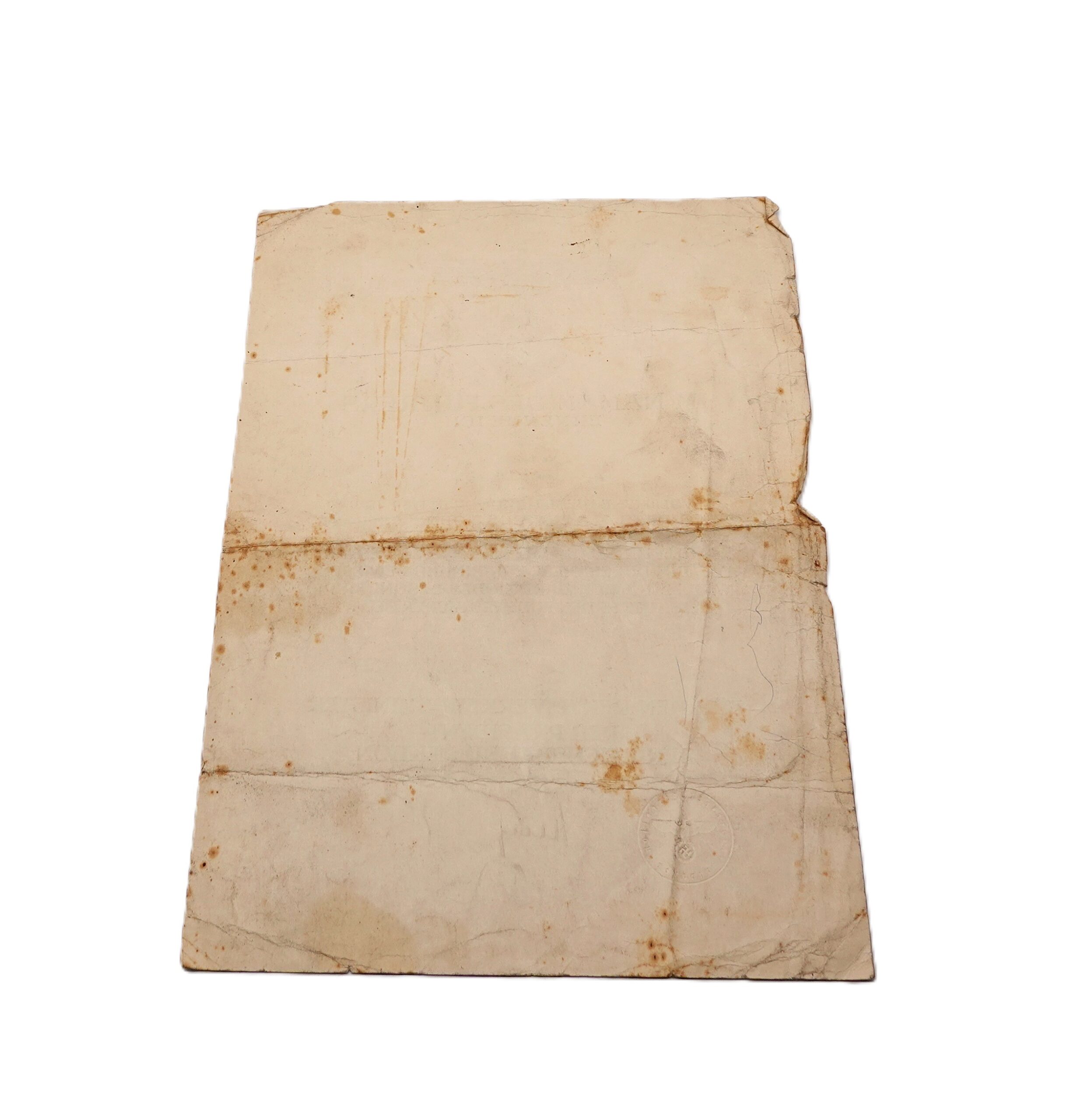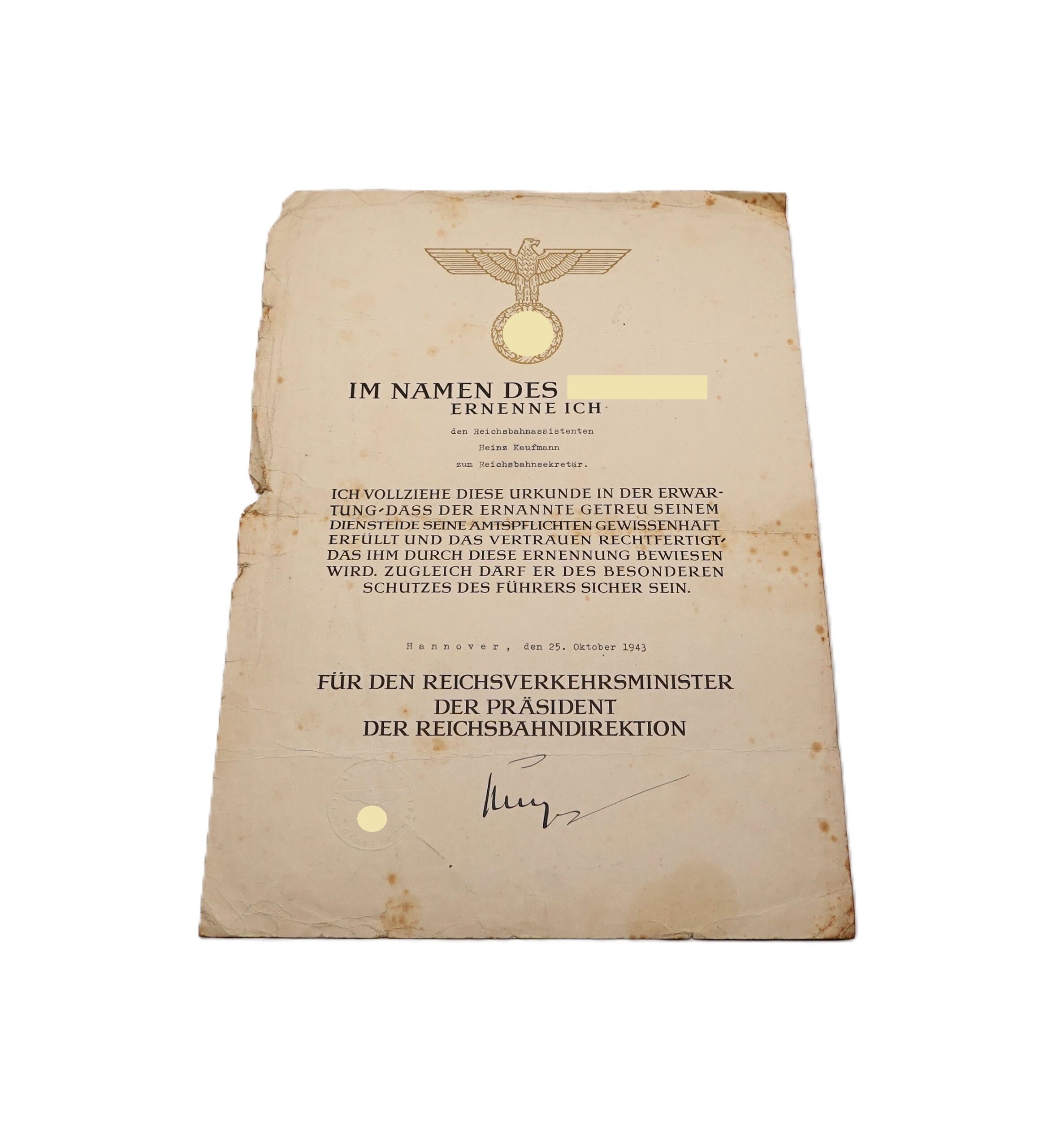 Urkunde der Reichsbahn für Heinz Kaufmann zur Beförderung zum Reichsbahnsekretär. Ausgestellt am 25. Oktober 1942 in Hannover. Urkunde ist mittig gefaltet. Ränder teilweise beschädigt mit Stockflecken. Gelebter Zustand.
