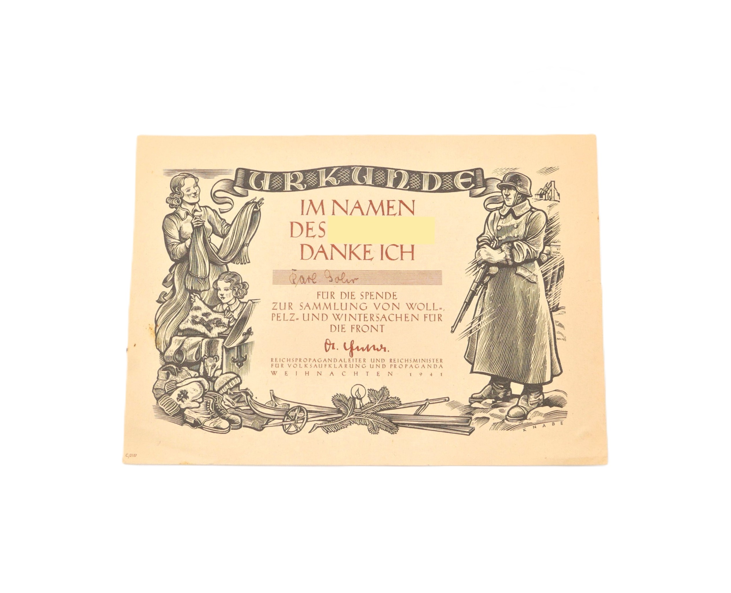 Urkunde – Spendenquittung – Für die Spende zur Sammlung von Woll-, Pelz- und Wintersachen für die Front. Mit den alterstypischen Gebrauchsspuren.