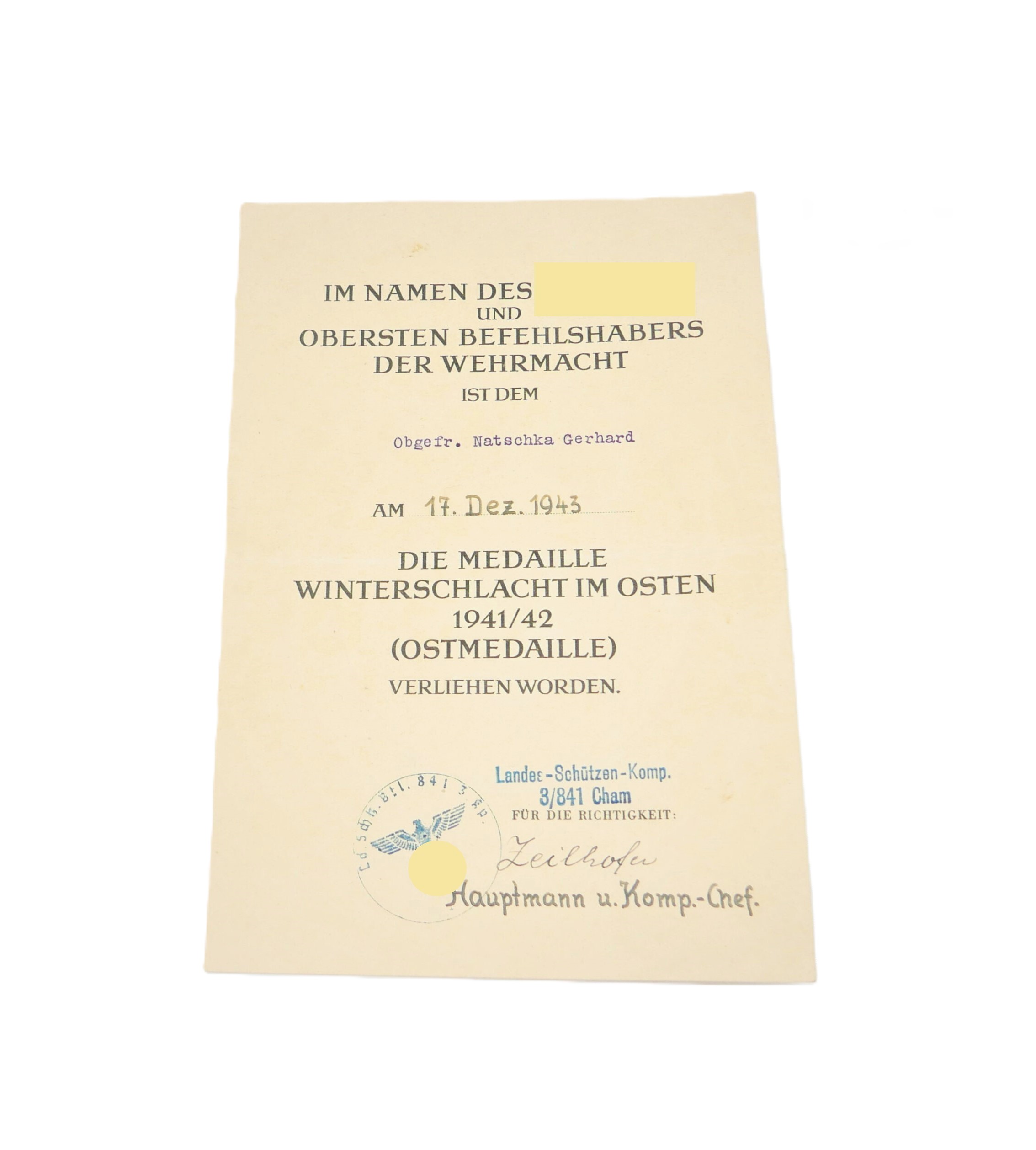 Urkunde zur Medaille Winterschlacht im Osten. Für den Obergefreiten Gerhard Natschka der Landes-Schützen-Komp. 8/841 Cham. Ausgestellt am 17. Dez. 1943. Masse 20 cm x 13,8 cm. Urkunde wurde einmal gefaltet.