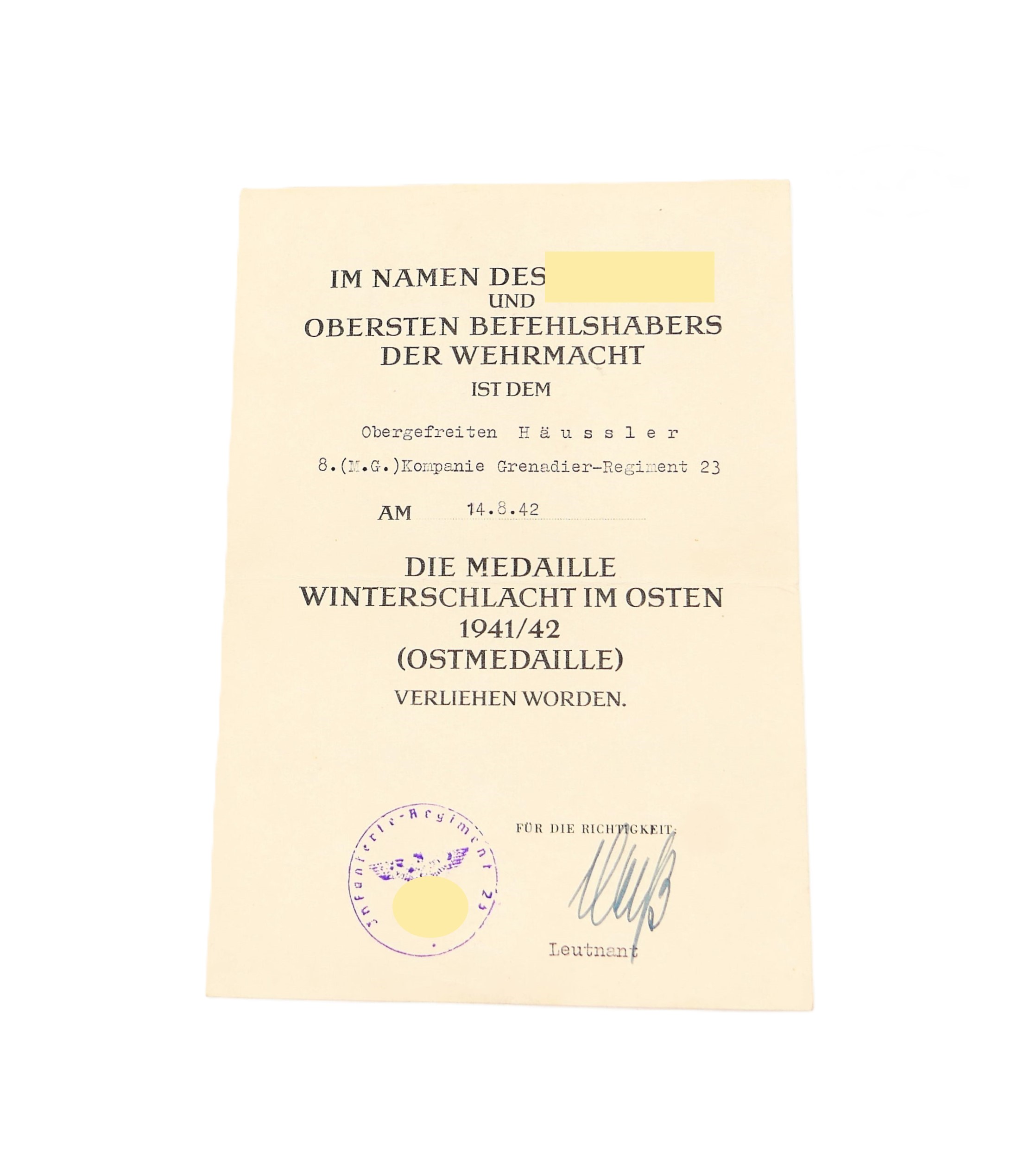 Urkunde zur Medaille Winterschlacht im Osten. Für den Obergefreiten Häussler des 8. (M.G.) Kompanie Grenadier-Regiment 23. Ausgestellt am 14. 08. 1942. Masse 20 cm x 14 cm. Urkunde wurde einmal gefaltet.