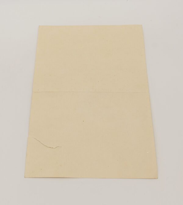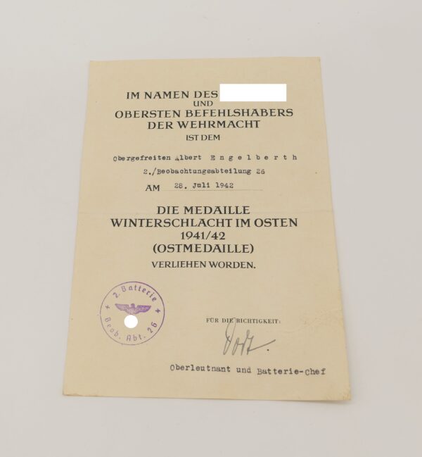Urkunde zur Medaille Winterschlacht im Osten. Für den Obergefreiten Albert Engelberth der 2. Beobachtungsabteilung 26. Masse 20,1 cm x 14,1 cm. Urkunde wurde einmal gefaltet und hat an einer Seite einen Einriss.