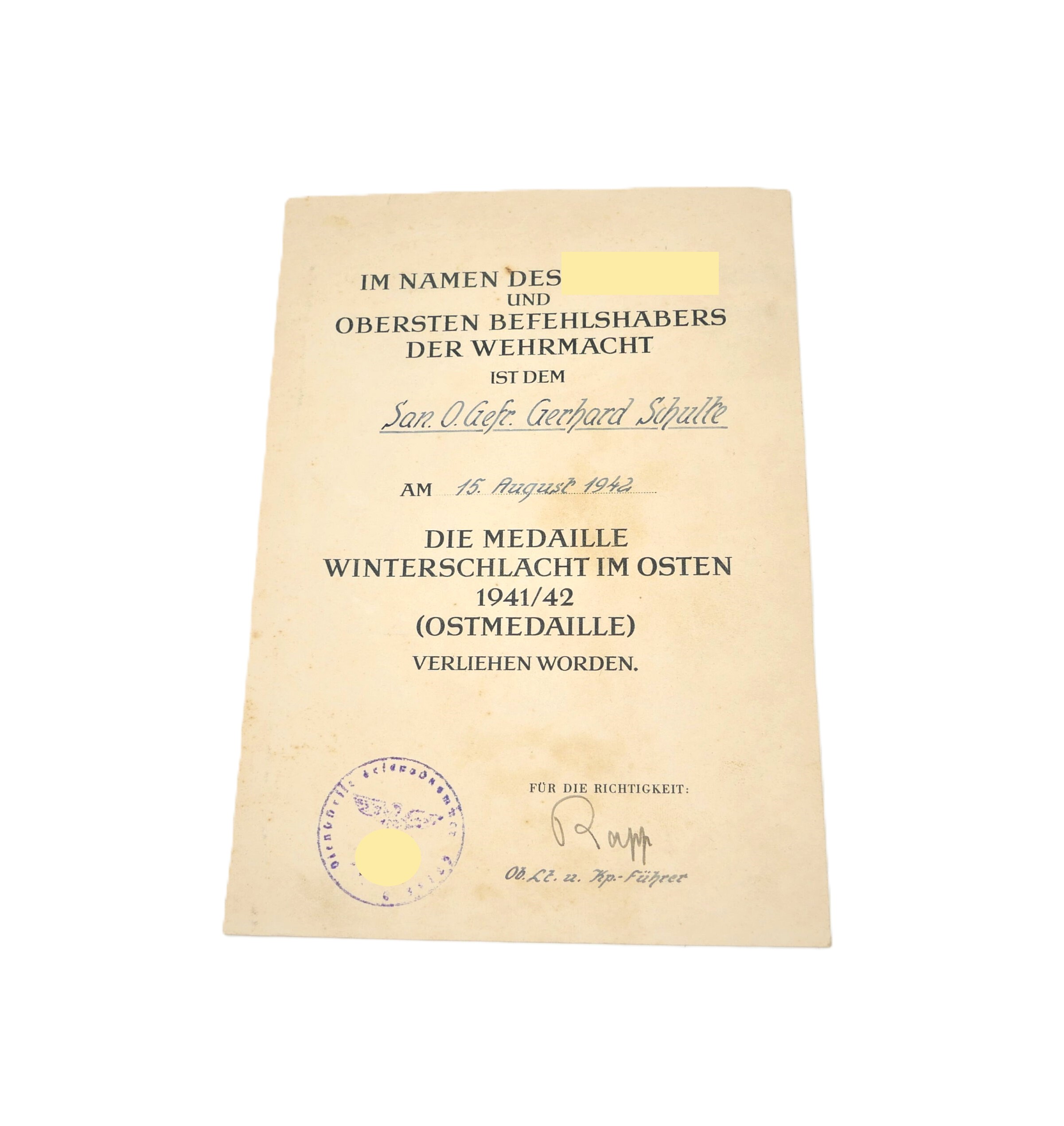 Urkunde zur Medaille Winterschlacht im Osten. Für den San. O. Gefr. Gerhard Schulte. Masse 19,9 cm x 14 cm. Urkunde ist etwas fleckig.