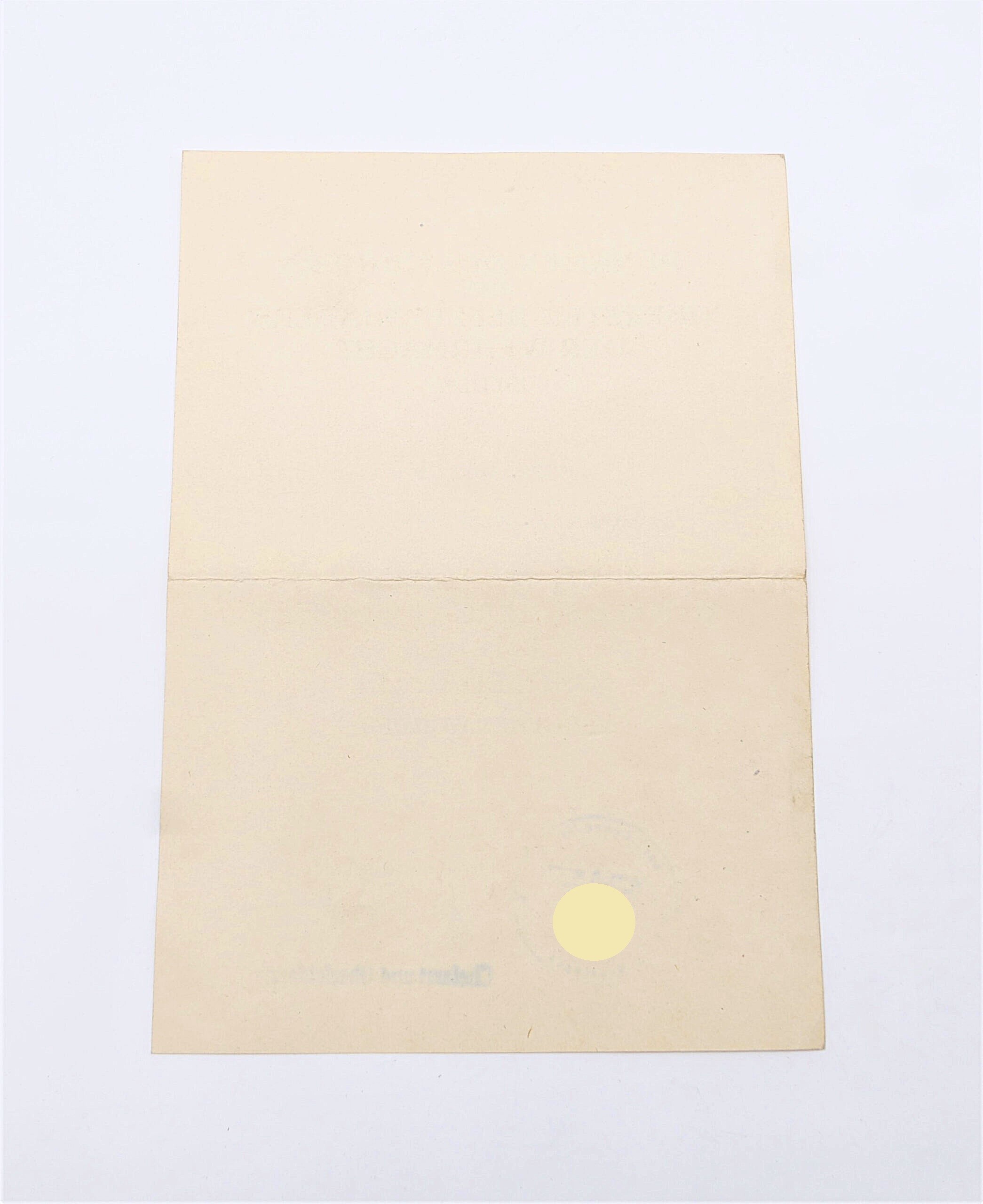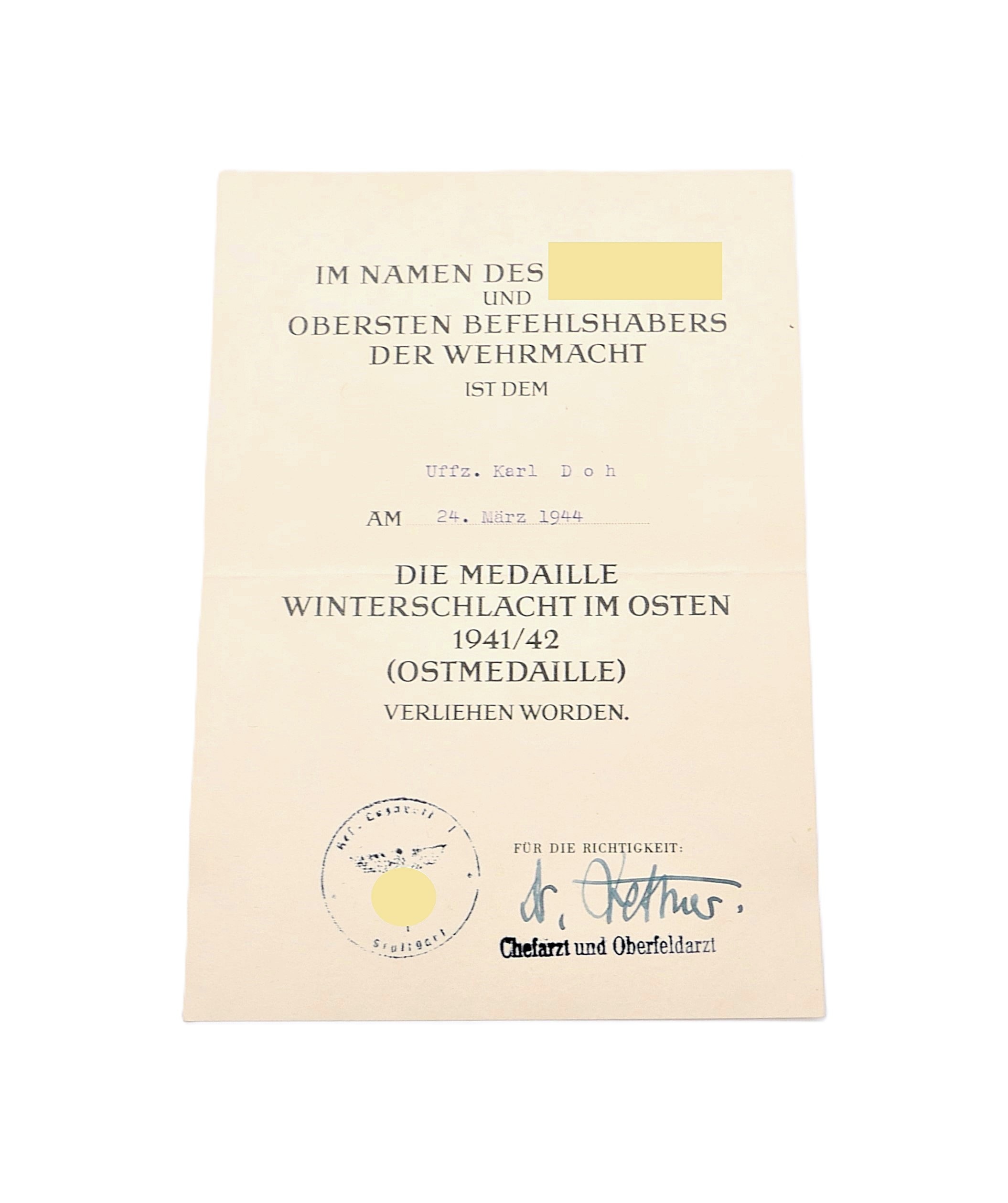 Urkunde zur Medaille Winterschlacht im Osten. Für den UFFZ. Karl Doh. Stempel vom Res. Lazarett, Stuttgart. Einmal gefaltet. Masse 20 cm x 14 cm.
