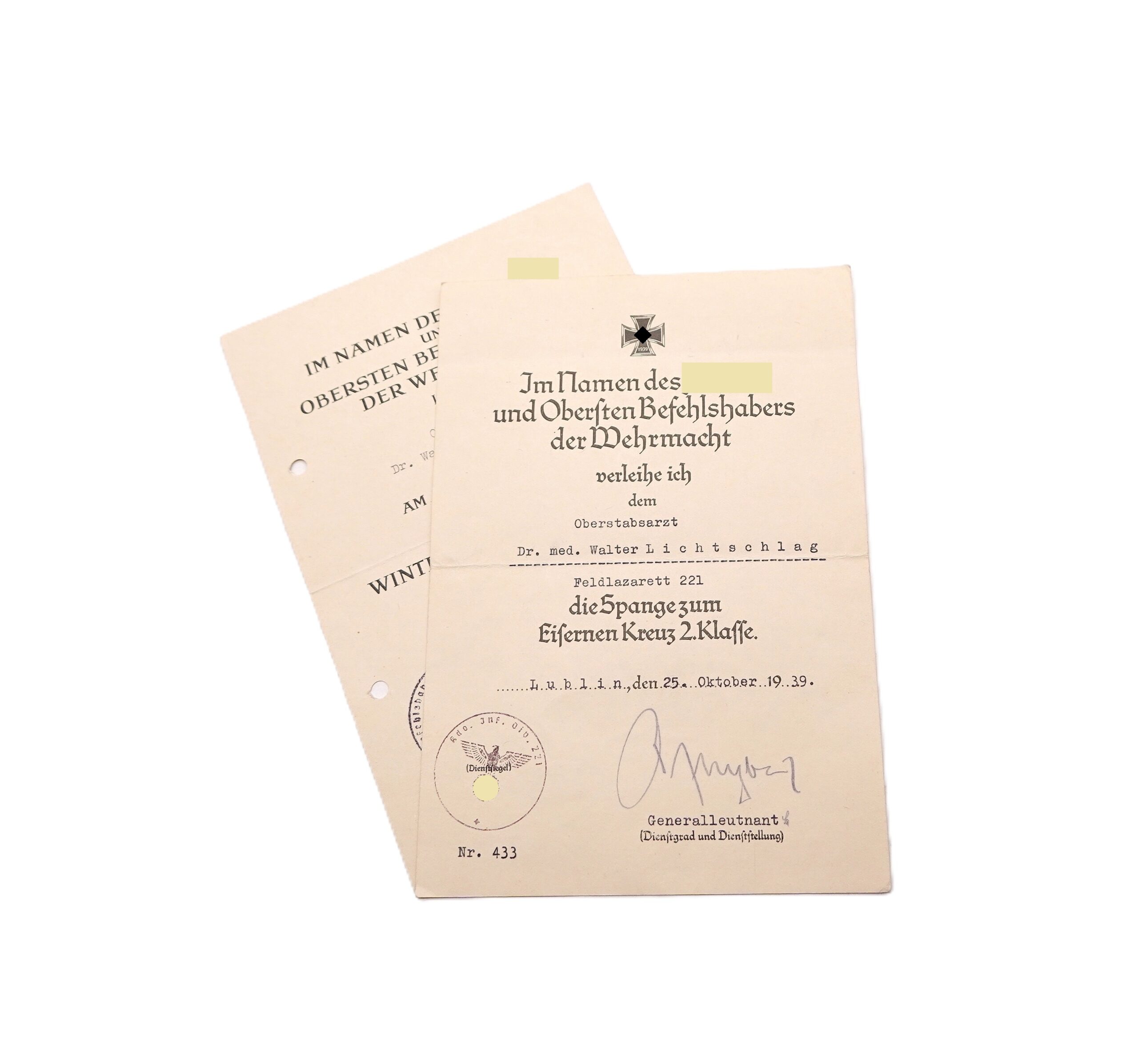 Urkunde zur Spange des Eisernen Kreuz (Wiederholungsspange) 2. Klasse. An den Oberstabsarzt Dr. Med. Walter Lichtschlag.