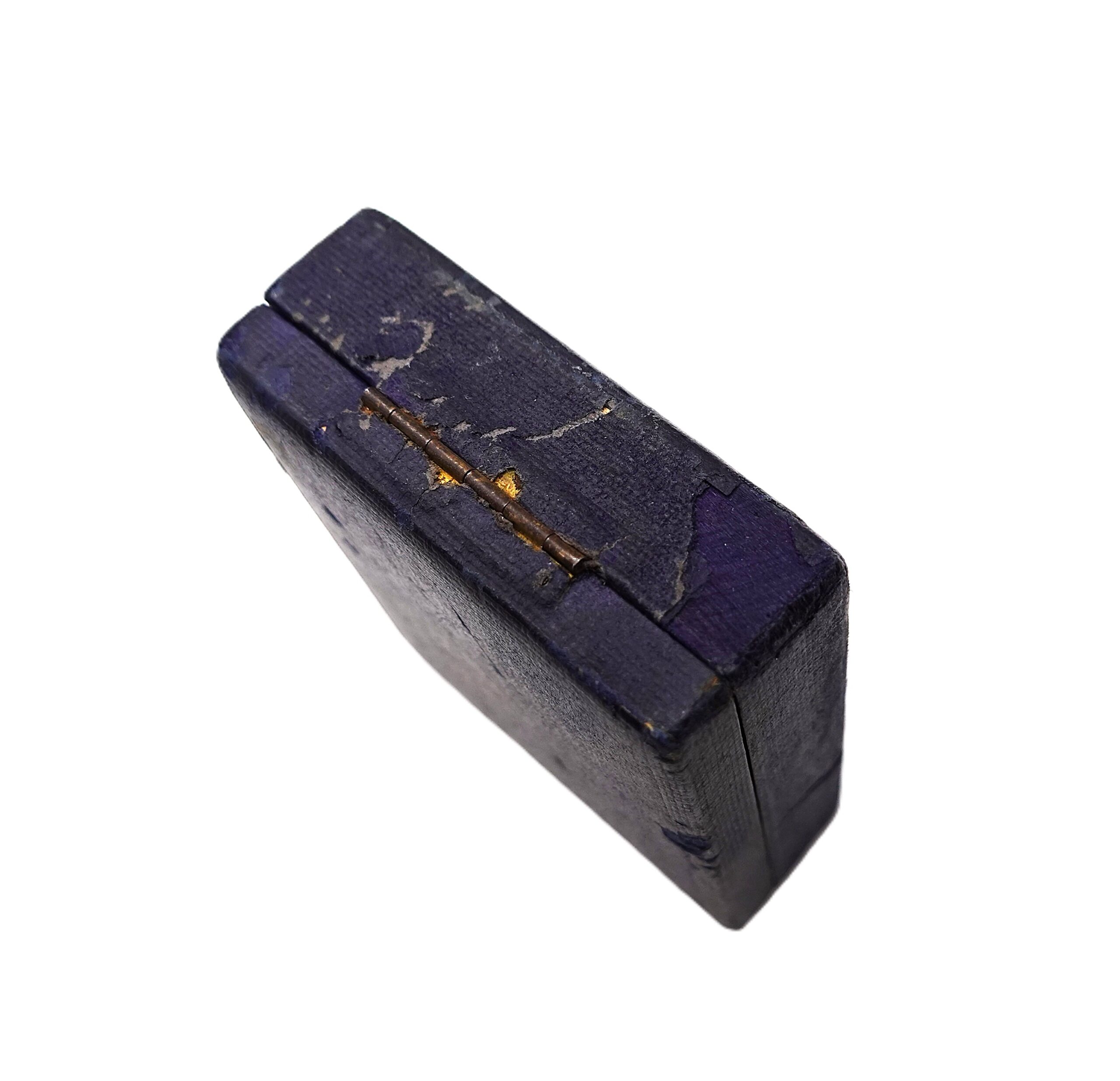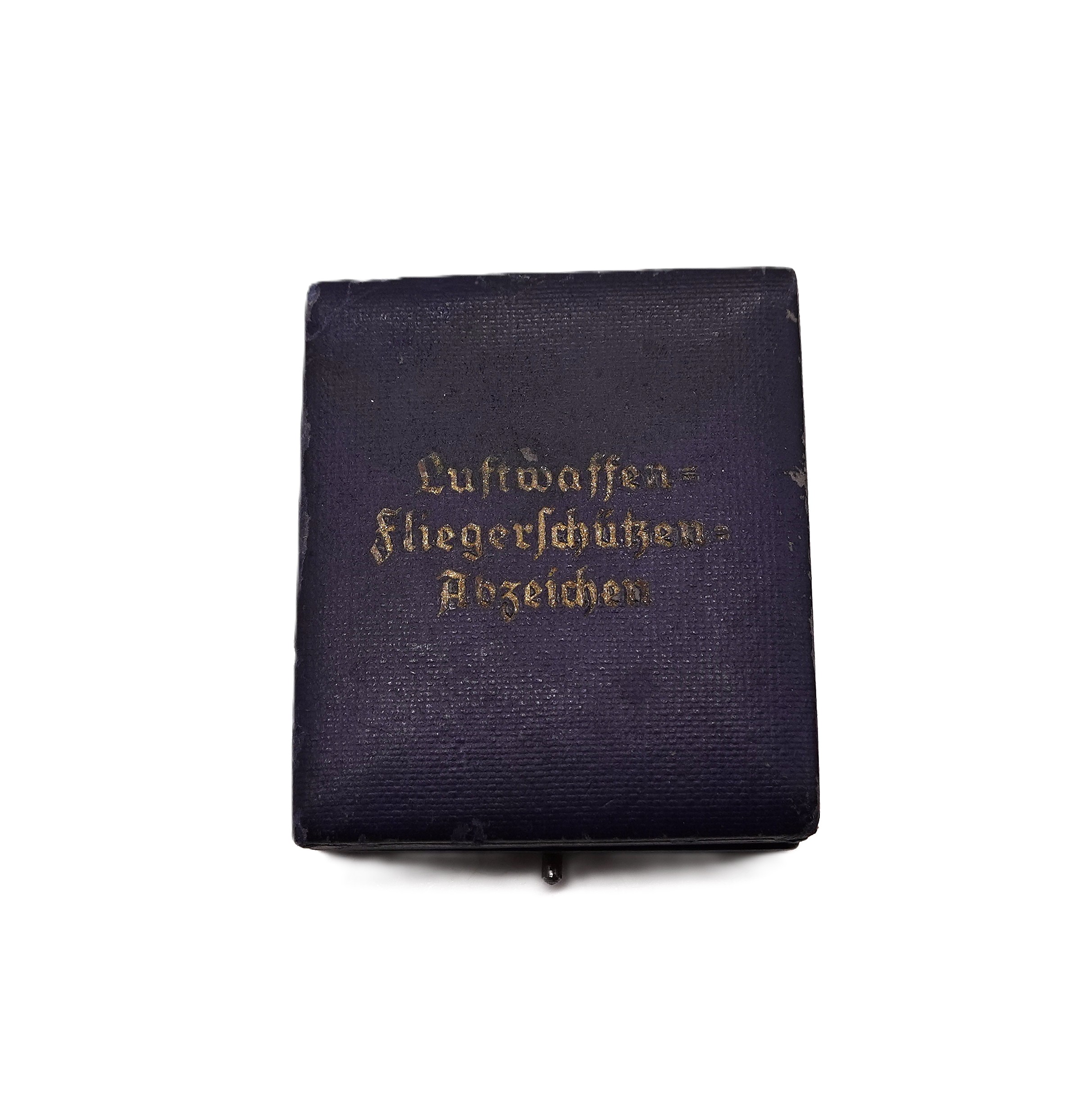 Frühes Verleihungsetui zum Luftwaffen = Fliegerschützen = Abzeichen. Der obere Teil des Deckels teilweise schwarz verfärbt. Einige Stellen des Bezuges fehlen und wurden farblich ausgebessert. Dafür von Innen recht schön. Deckel schließt einwandfrei. Abdeckung des Schariers fehlt. Gelebtes Exemplar.