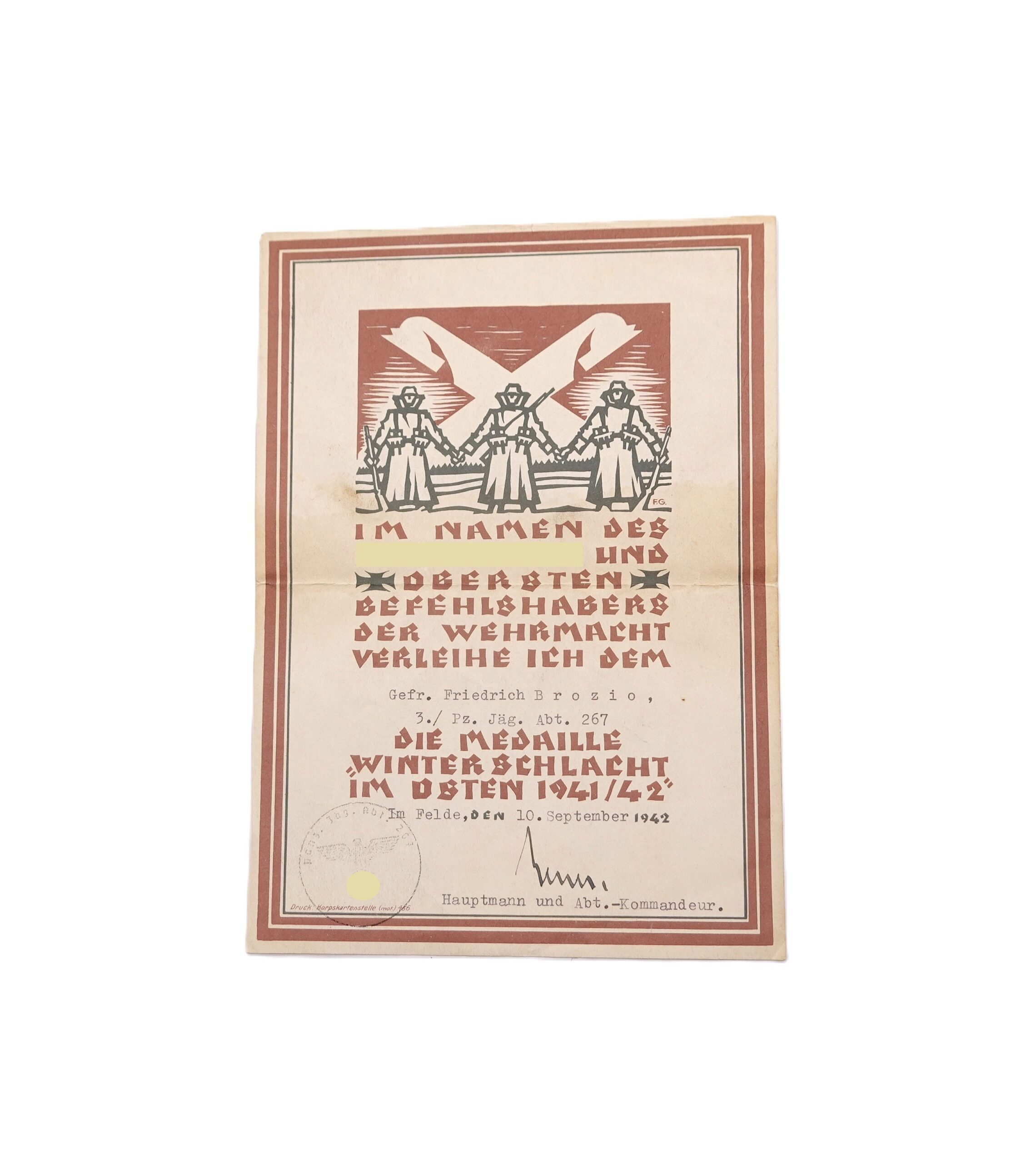 Seltene Verleihungsurkunde/Schmuckurkunde zur Medaille Winterschlacht im Osten des Gefreiten Friedrich Brozio, Angehöriger der 3./Pz. Jäg. Abt. 267.