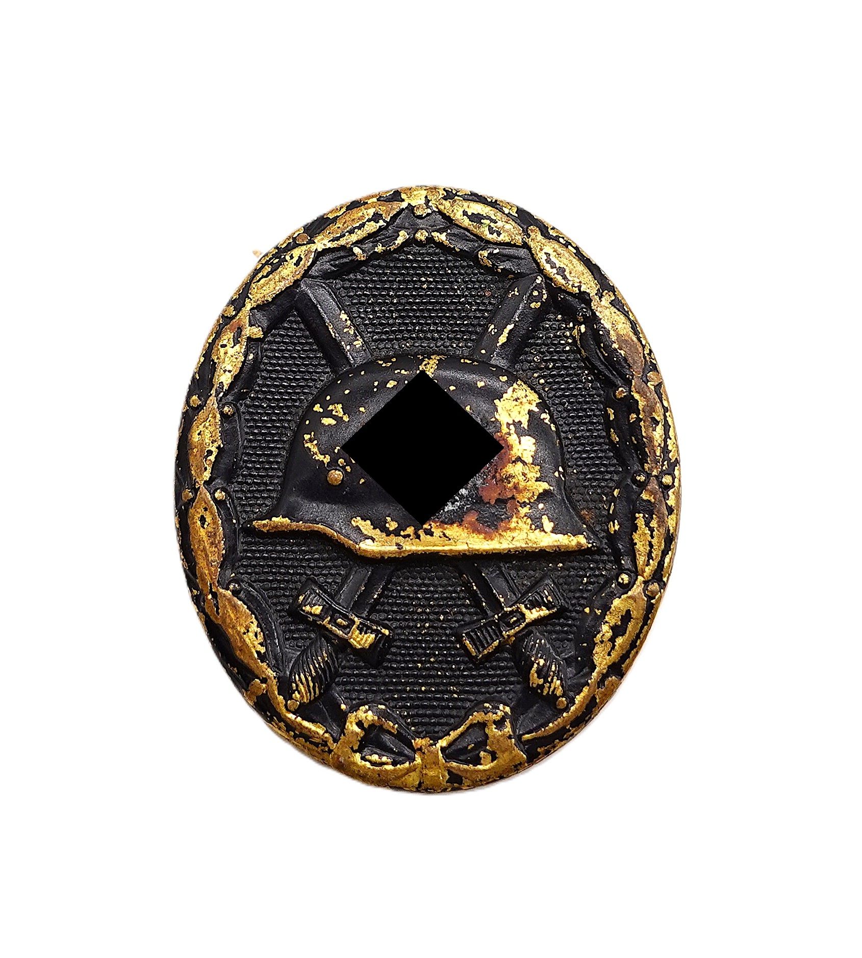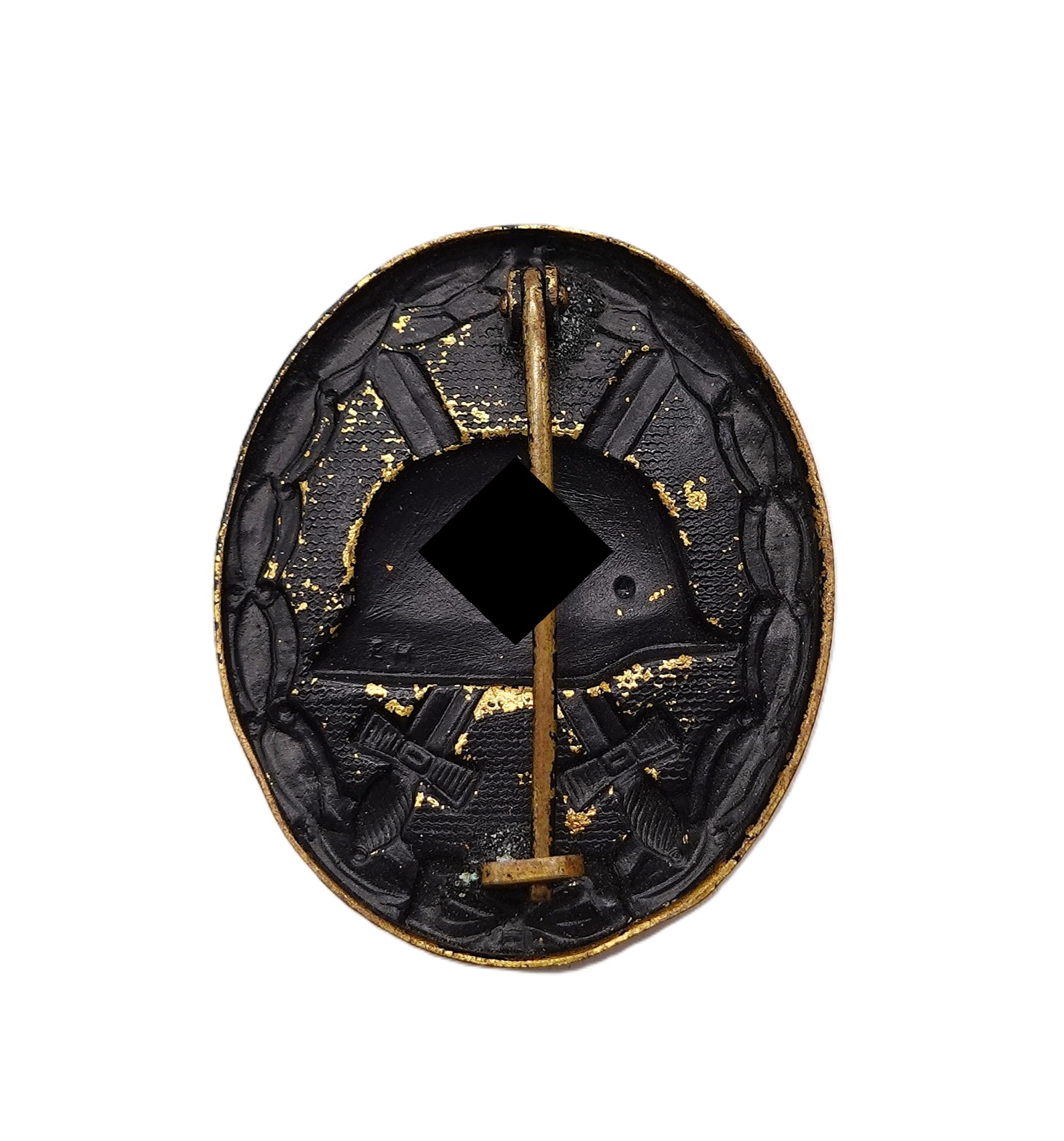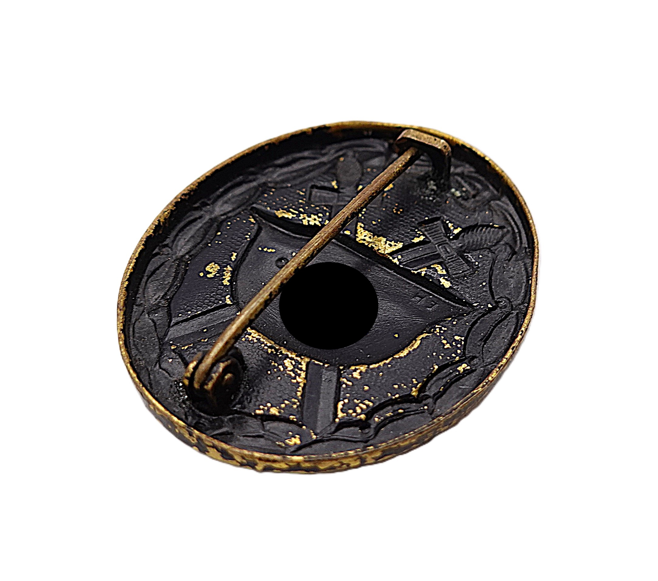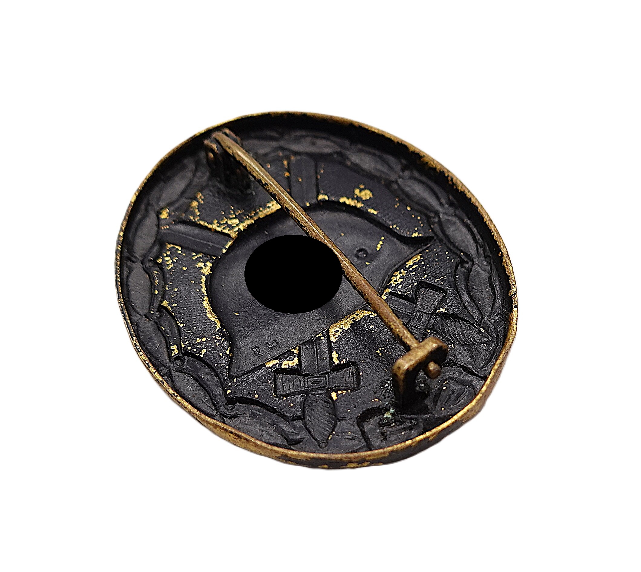 Verwundetenabzeichen Schwarz. Rückseitig die Herstellerkürzel E.H. für den Hersteller Eduard Hahn, Oberstein. Variante aus Buntmetall. HK ohne Farbe. Getragener Zustand.