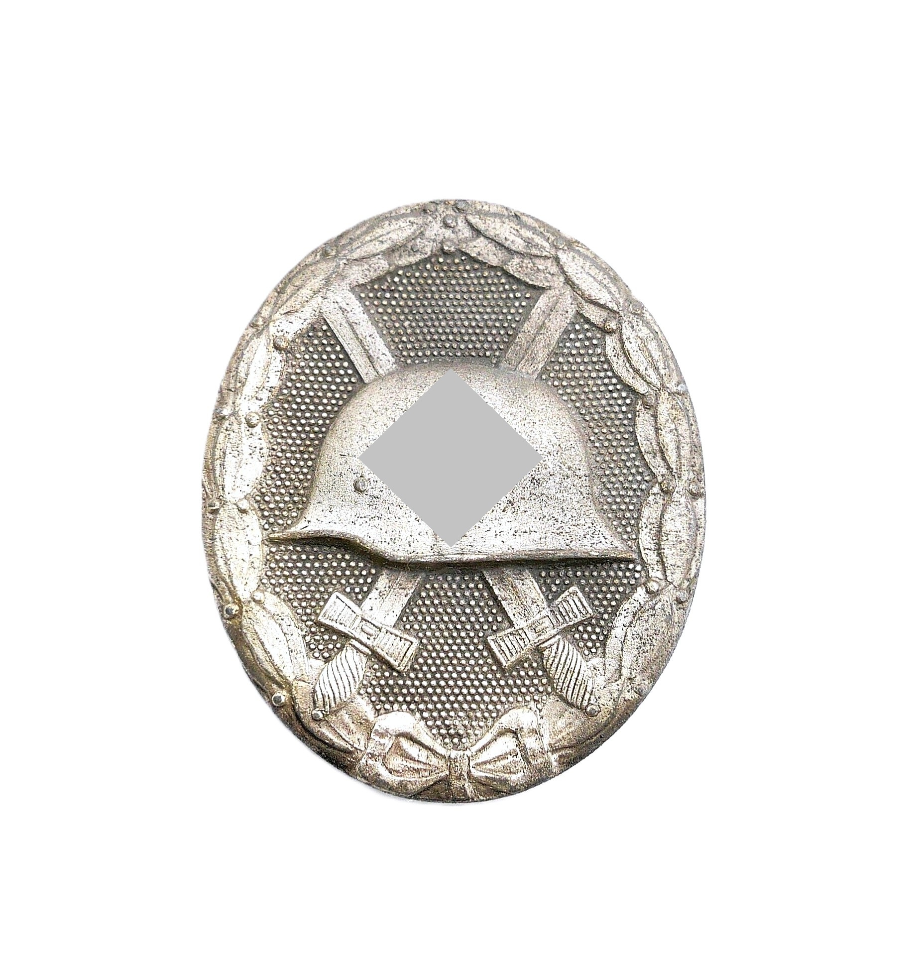 Verwundetenabzeichen Silber. Hersteller L/14 (Friedrich Orth, Wien). Variante mit breiter, hohlgekehlter Nadel. Zinkstück mit vergangener Versilberung. Nadel aus Eisen. Getragener Zustand.