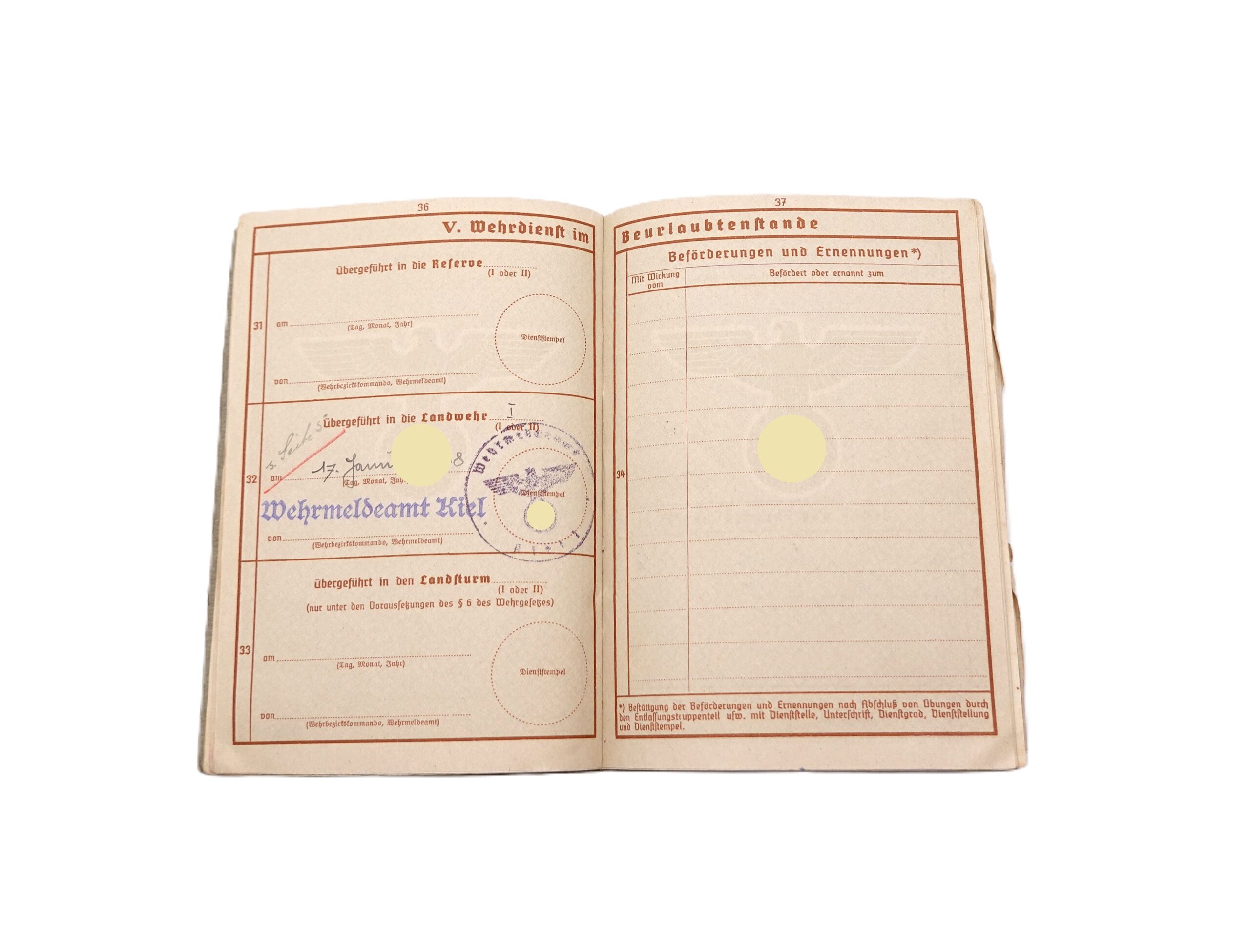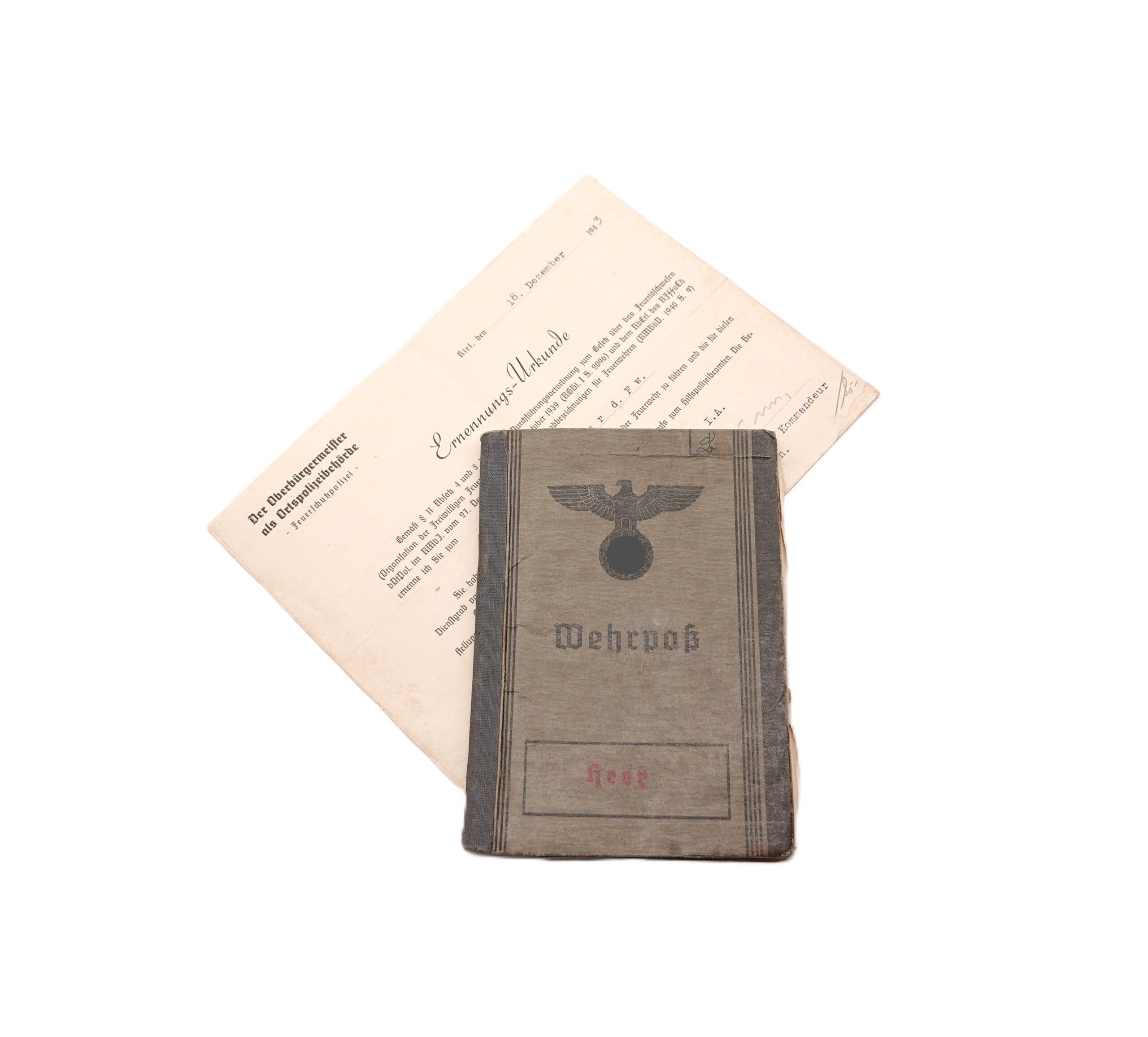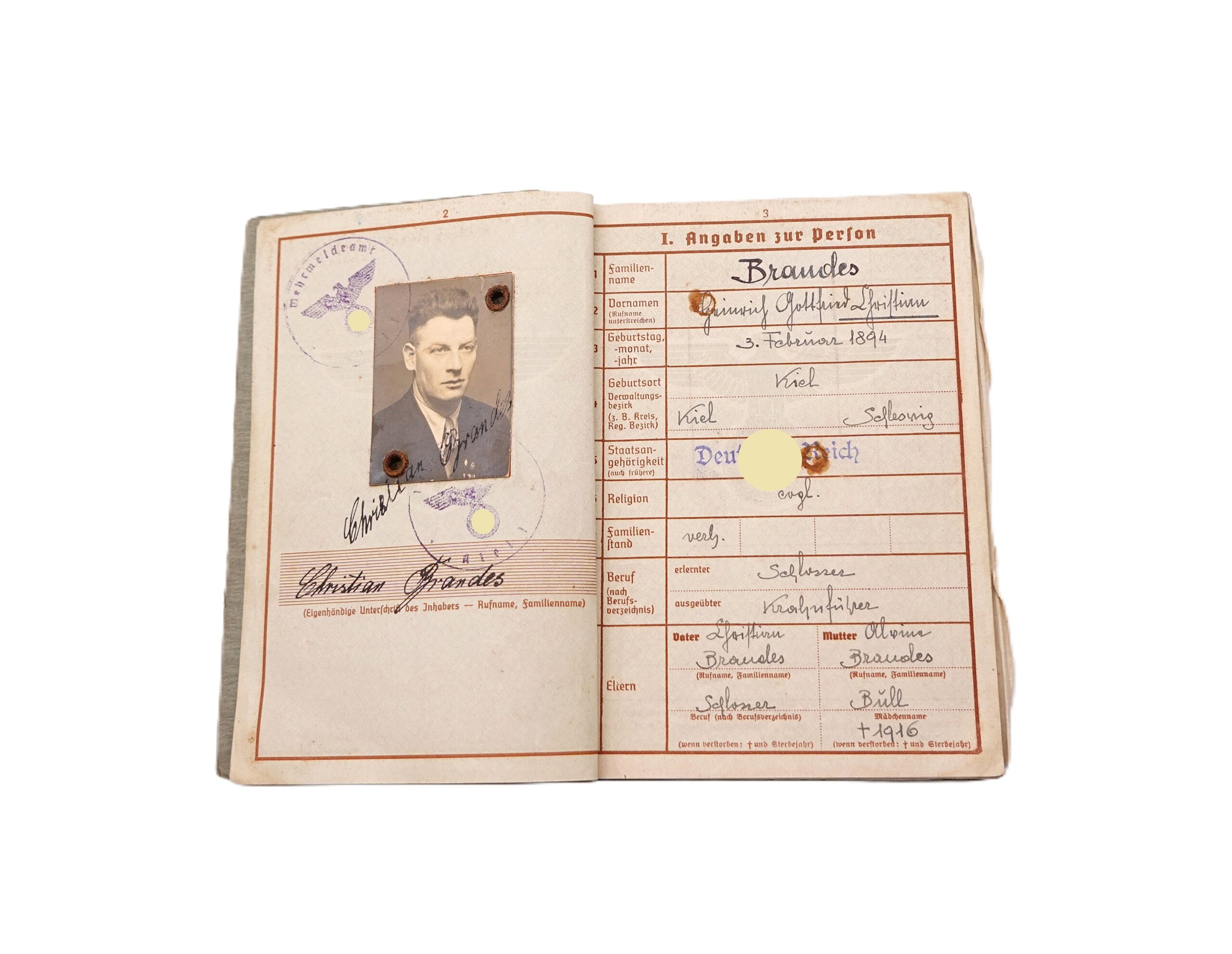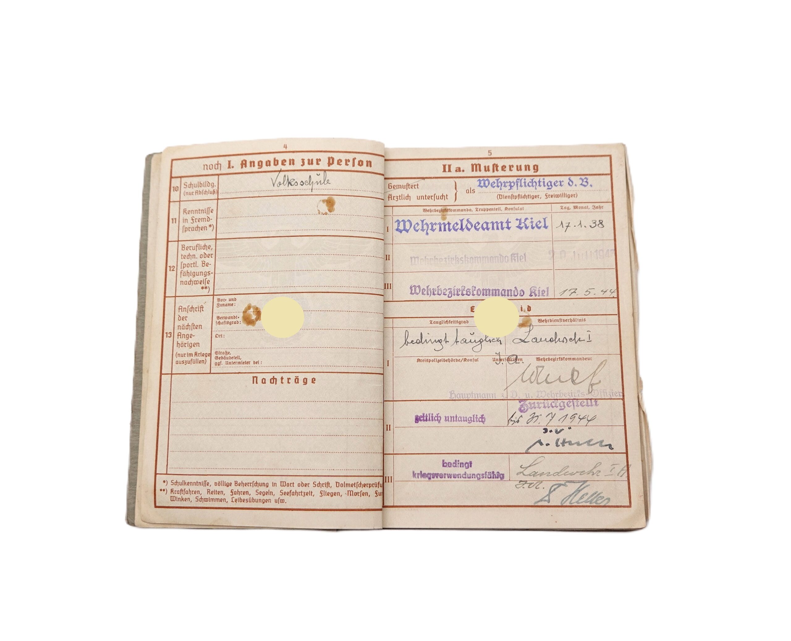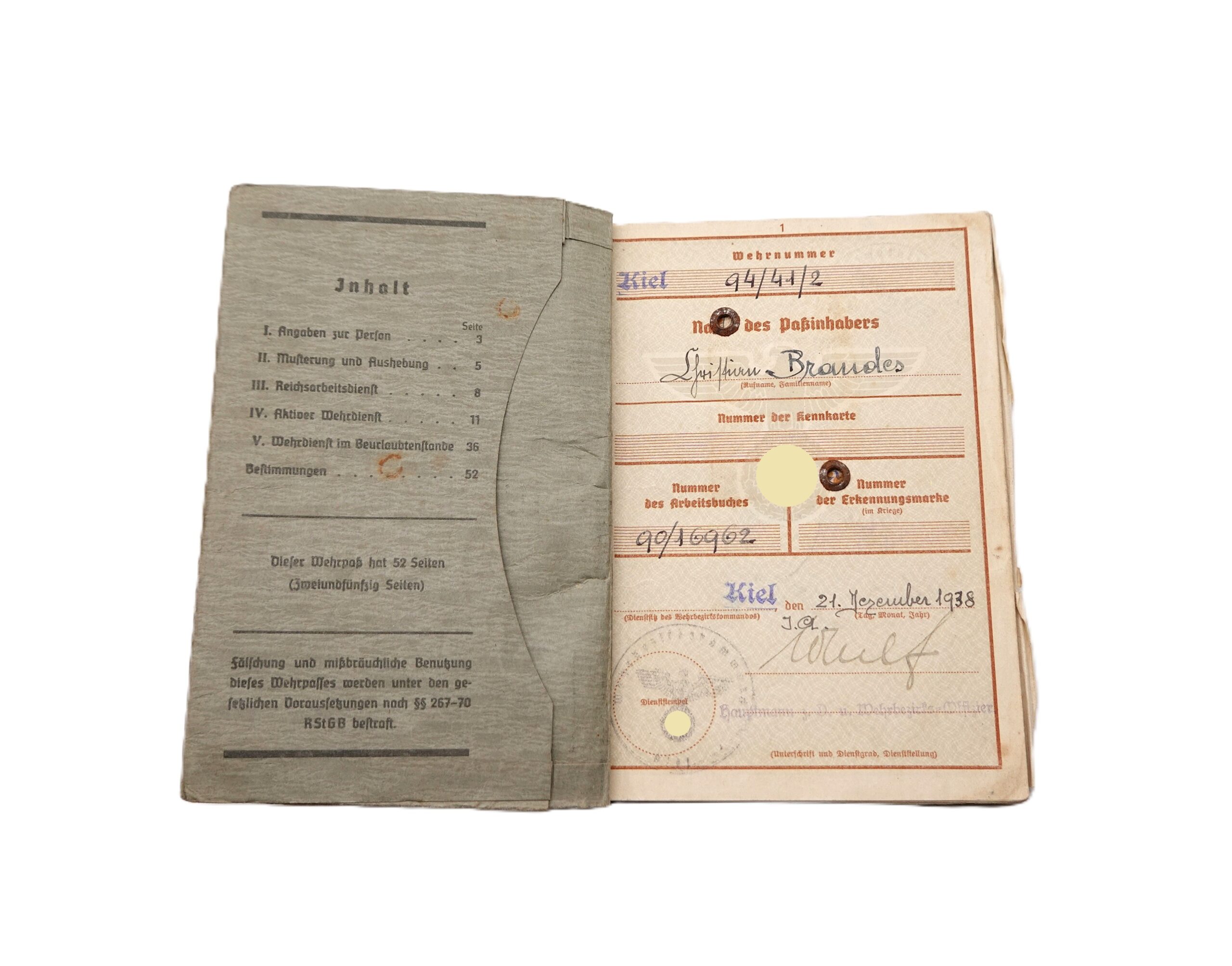 Wehrpass Heer und eine Ernennungsurkunde zum Wachtmeister der Feuerwehr. Für den Kranführers Christian Brandes aus Kiel. Wehrpass hat nicht viele Eintragungen. Habe alles Fotografiert. Er wurde 1938 in die Landwehr überführt.