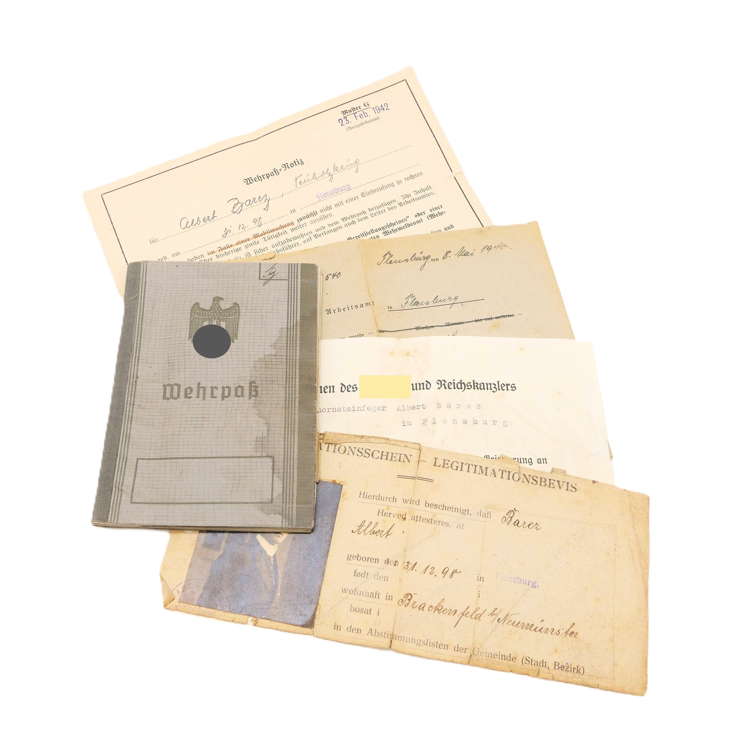 Wehrpass und die Urkunde zum Ehrenkreuz für Frontkämpfer des Albert Barez. Einen Schornsteinfeger aus Flendsburg. Er wurde der Landwehr zugeteilt. Anbei noch weitere Papiere.