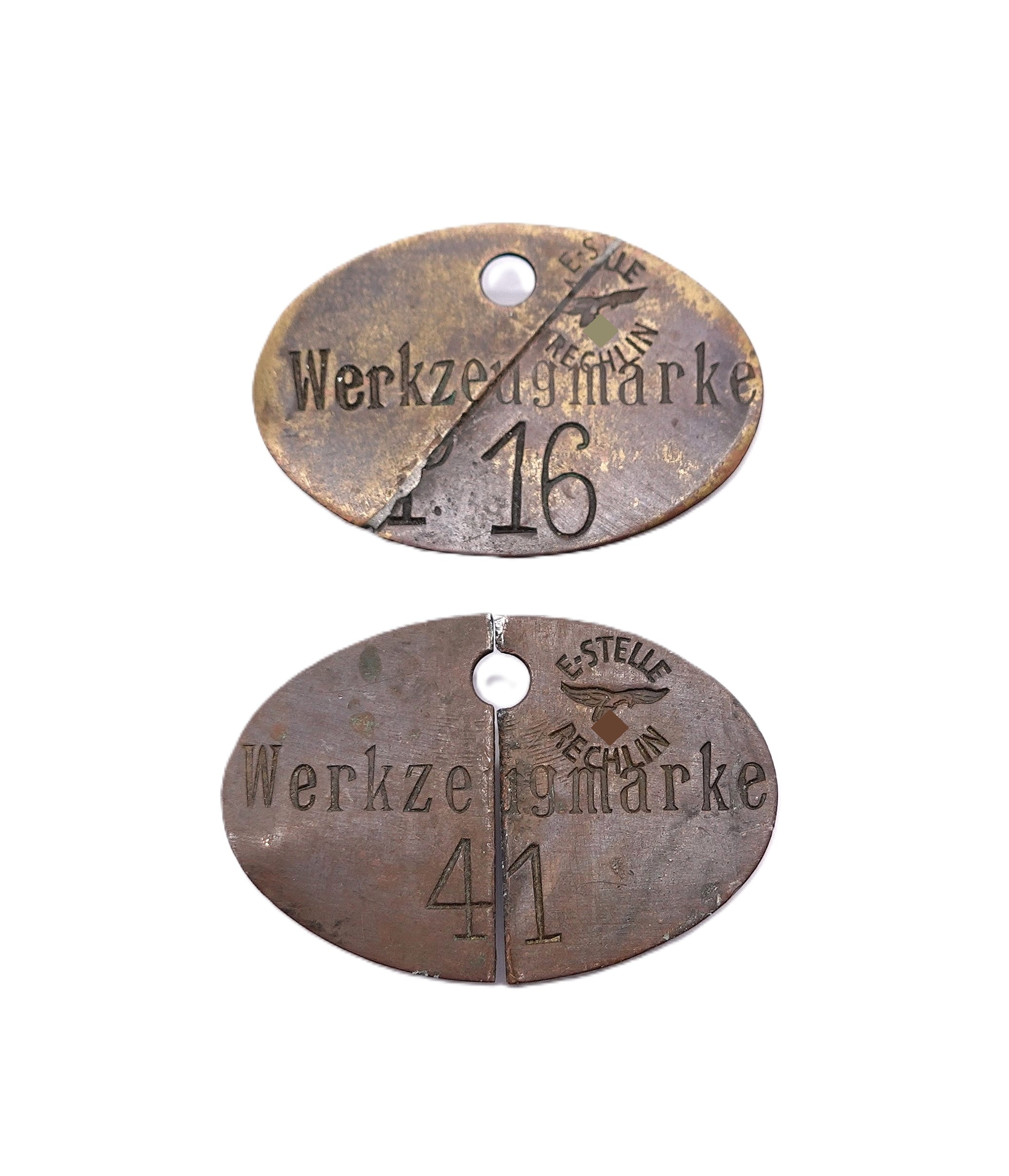 2 x Werkzeugmarke E- Stelle (Erprobungstelle) Rechlin – Luftwaffe. Wurden mal zerteilt. Eine wurde wieder zusammengesetzt. Bodenfund.
