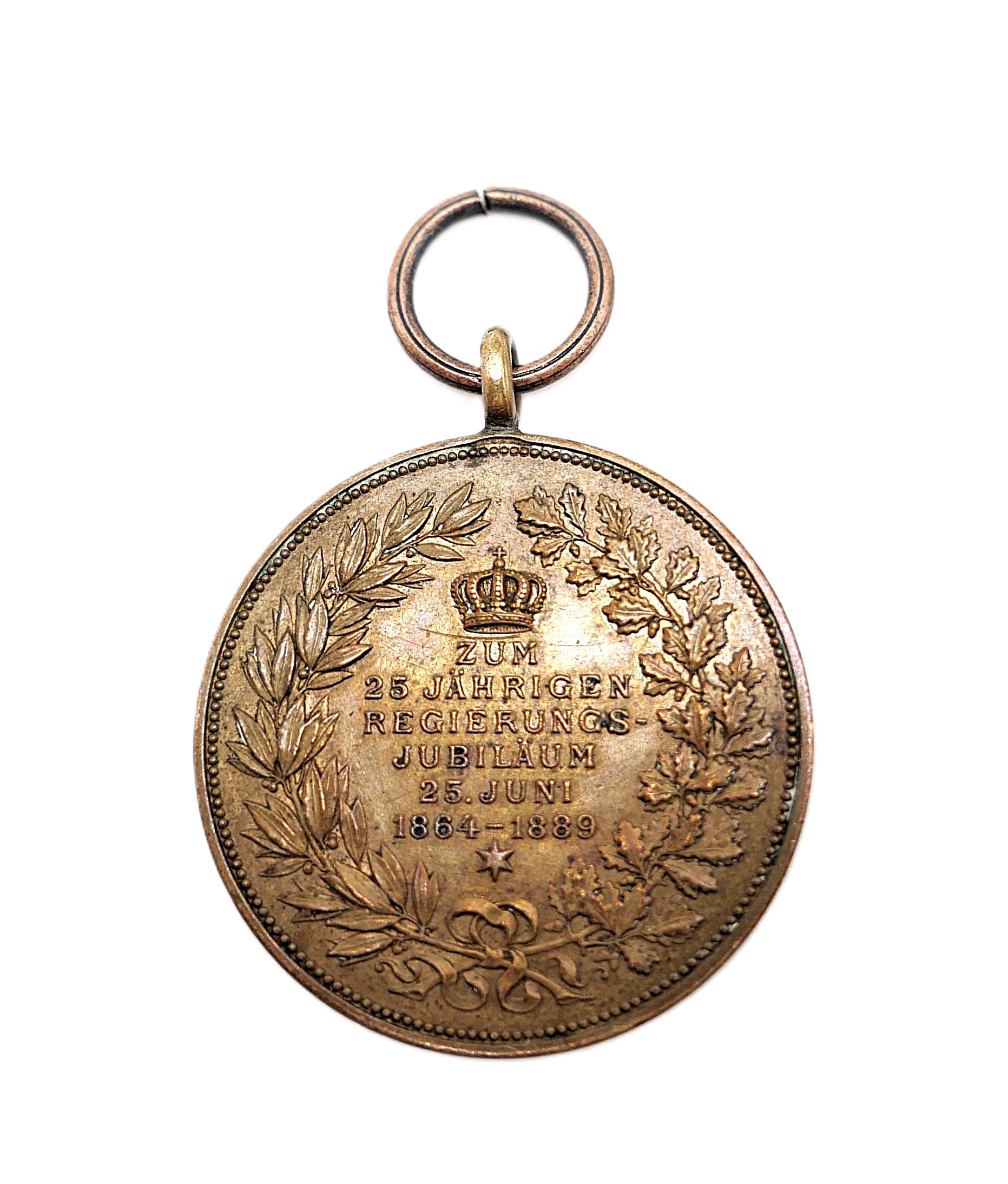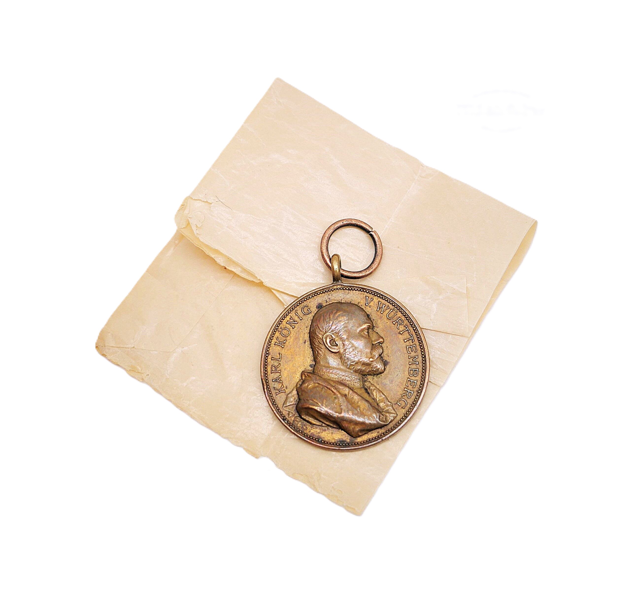Württemberg – Medaille zum 25. Regierungsjubiläum König Karl – 25. Juni 1864 – 1889 – Bronze. Band fehlt. Der Ring wurde mal ergänzt. Getragener Zustand. Mit der Cellophan Verleihungstüte. Diese ich allerdigs unten und an der Seite auf.